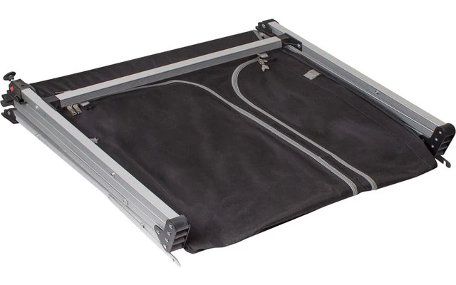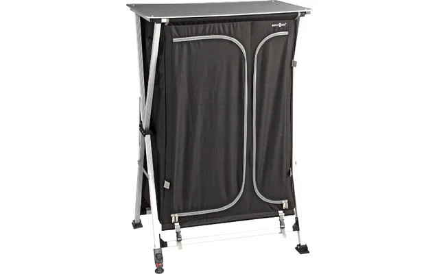 Großer Camping-Multifunktionsschrank mit 2 getrennten RV-Fächern und 6 innenliegenden Ablagen. Das schmälere Fach kann zudem dank mittig teilbarer Ablagen und einer eingebauten Hängestange zum Kleiderschrank umgebaut werden. Sehr stabile Ausführung mit Alu-Kreuzgestell und verwindungssteifen Rechteckprofilen. Vorder- und Hinterwand können durch eine spezielle Spannvorrichtung zusätzlich stabilisiert werden. Breite, schwenkbare Fußplatten verhindern das Einsinken des Schranks auf weichen Böden oder verhindern Beschädigungen am Zeltboden oder -teppich. Ein höhenverstellbarer Fuß erlaubt einen perfekten Niveauausgleich bei Bodenunebenheiten. Ein Gazefenster in der Rückwand sorgt für die Innenbelüftung des Schrankes. Mit praktischer Transport- und Aufbewahrtungstasche.