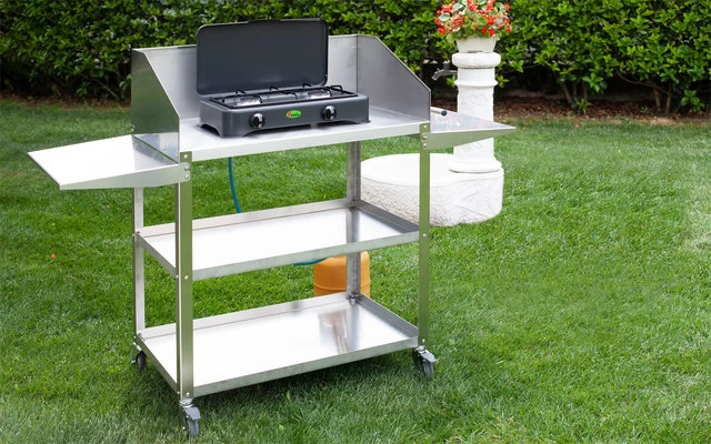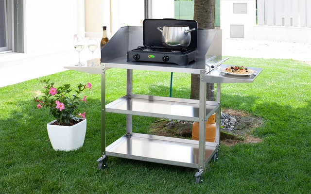 Hochwertiger emaillierte Kocher mit schwarz-emailliertem Rost und Brennerabdeckungen.