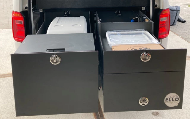 Eine vollwertige Heckküche bietet Abstellfläche für Gaskocher, eine Wasserversorgung mit fließend Wasser, eine Spüle auf Seitenauszug und extra Raum zur Integration passender Kühlboxen (bei zwei Schubkästen).