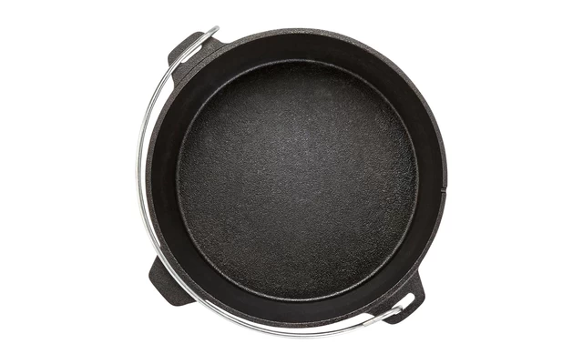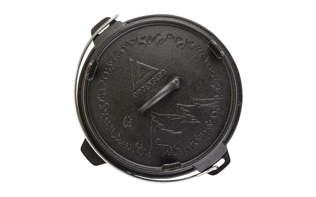 Gusseiserner Topf mit hoher Wärmeleitfähigkeit und konstanter Rundumwärme. So werden Eintöpfe, Suppen, Gemüse, Fleisch oder Brot schonend zum Genuss. Der Deckel ist leicht konkav gewölbt damit das Kondenswasser im Inneren zum Rand hin abfließen kann und beim Anheben des Deckels nichts ins Gericht tropft. Ein Dampfauslass am Deckel verhindert lästiges Klappern oder Überkochen. Besonders Praktisch: Der Deckel lässt sich auch als Pfanne oder Servierteller nutzen und steht, dank seiner Füße auf der Oberseite, leicht erhöht und absolut sicher. Geeignet für Grill, Gasherd, Backofen oder offenes Feuer.