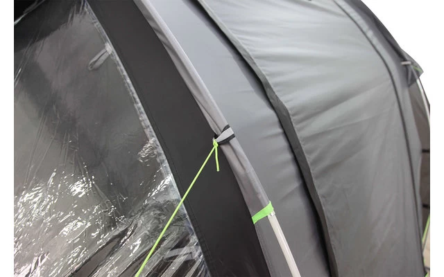 Familien-Tunnelzelt in Stehhöhe. Der große Vorbau mit Gaze-Seitentür und Gazefenster kann optimal belüftet werden und bietet reichlich Platz für die Campingausrüstung und Aufenthalt bei schlechtem Wetter. Klarsichtfolienfenster bringen das Tageslicht in die Wohnung und die Gardinen schützen vor neugierigen Blicken. Der pflegeleichte Zeltboden, am Innenzelt angenäht, kann sich nicht verschieben. Die Faulstreifen halten Schmutz und Feuchtigkeit ab. 3 Dauerventilationen belüften das Zelt bei jeder Wetterlage optimal und müssen immer geöffnet sein. Das Zelt hat extra starke Reißverschlüsse und reflektierende Abspannschlaufen für mehr Sicherheit. Die sehr stabilen 5 mm Durchmesser Stahl-Erdnägel verbiegen sich auch bei hartem Untergrund nicht. Für die Abspannung werden spezielle 5 mm Stahl- Erdnägel mit Haken für besseren Halt der Spannleinen geliefert. Die Reißverschluss ‚Abdeckung ist mit einer zusätzlichen Regenrinne ausgestattet.