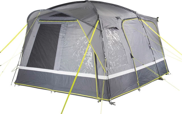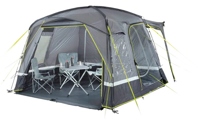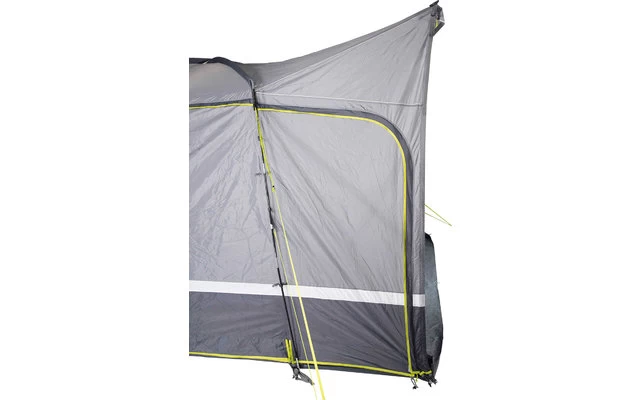 Die Dachkonstruktion und die Seitenwände bieten ein optimales Raumgefühl. Der fest vernähte Boden mit dem Außenzelt verhindert das Eindringen von Schmutz, Nässe, Krabbeltieren und schützt vor Zugluft. Die Bodenwanne ist am Eingang herunterklappbar und verhindert Stolperfallen. Der Eingang kann als Vordach mittels den mitgelieferten Aufstellstangen ausgestellt werden. 2 Gazefenster aus extra starkem, reißfestem 150D „Superfine“ Moskitonetz belüften den Wohnbereich und halten Insekten aus dem Zelt. Die innenliegenden Reißverschluss-Fensterklappen können einfach und variabel je nach Wetterbedingung bedient werden. 2 Klarsichtfolienfenster mit innenliegenden Reißverschluss-Fensterklappen können einfach und variabel bedient werden. 2 Dauerventilationen belüften das Zelt an regnerischen Tagen. Verschließbare, 50/50 teilbare Rückwand. Die gesamte Rückwand passt in die Easy Stow Away Tasche und es entfällt das lästige Aufrollen. Extra robuste Reißverschlüsse mit Regen- Abdeckung gegen Feuchtigkeit. 4 Neon gelbe verstellbare Sturmbänder und Abspannleinen sind in der Dämmerung gut sichtbar. Kabeleingang mittels Reißverschluss und Kabelführung für Beleuchtung.