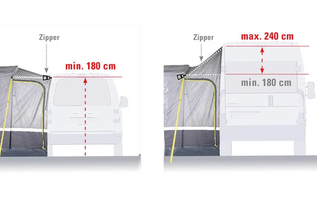 Die Schleuse hat eine Dach- Befestigungslänge von 210 cm und eine verstellbare Anbauhöhe von 180-220 cm mittels Reißverschluss und verstellbarem Gurtband.