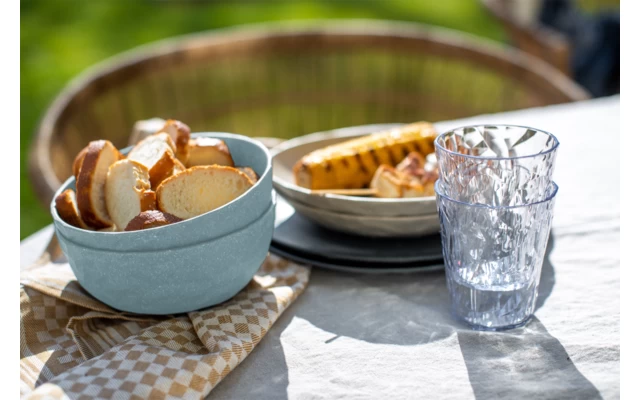 Das Geschirrset ist aus umweltfreundlichem thermoplastischem Kunstoff hergestellt und bringt frischen Wind in jeden Outdoor-Lunch oder Terrassen-Dinner und hält auch turbulenten Feiern ohne jeden Scherbehaufen stand. Die solide Materialität und die modernen Farben vermitteln stets das gute Gefühl eines schön gedeckten Tisches. Das Material bleibt lange schön und ist natürlich spülmaschinenfest. Ideal für alle Outdoor-Aktivitäten, bei denen man auf stilvolles Geschirr keineswegs verzichten möchte.