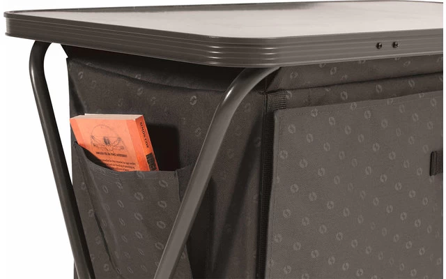 Praktisch, leicht aufzubauender Schrank mit einem Aluminiumgestänge, welches für hervorragende Stabilität sorgt. Die robuste, herunterklappbare Tür mit Griff bietet einen geräuscharmen nutzbaren Stauraum wie zu Hause. In der Tür ist ein Magnetverschluss eingearbeitet. Der Schrank beinhaltet zwei große Fächer, wo Sie ihre Utensilien unterbringen können. Ebenso befindet sich an der Seite eine Organiser-Tasche für zusätzlichen Stauraum. An seitlichen Haken lassen sich ohne Probleme mehrere Handtücher oder ähnliches, anbringen.