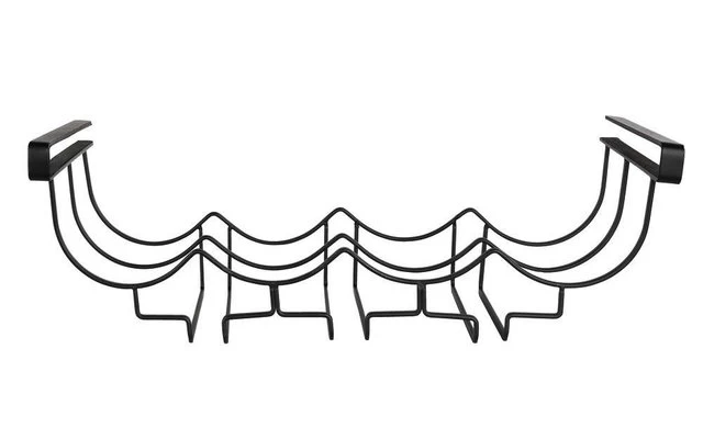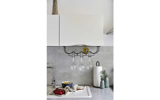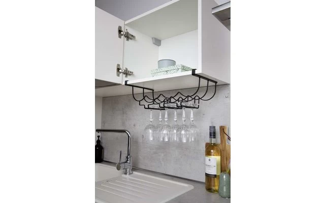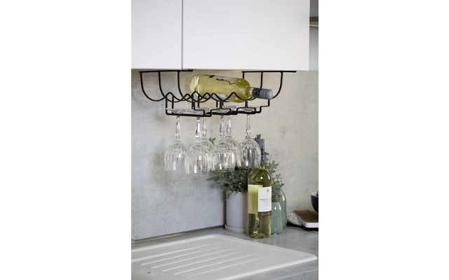Wenn der Platz in der Küche knapp bemessen ist, ist der dekorative, schwarze Flaschen- und Gläserhalter eine praktische Alternative, um möglichst viele sauber gespülte Wein-, Sekt- oder Biergläser und Weinflaschen platzsparend und ordentlich im Schrank oder unter dem Regal unterzubringen. Bei Bedarf kann der Halter mit einem Griff wieder entnommen werden.